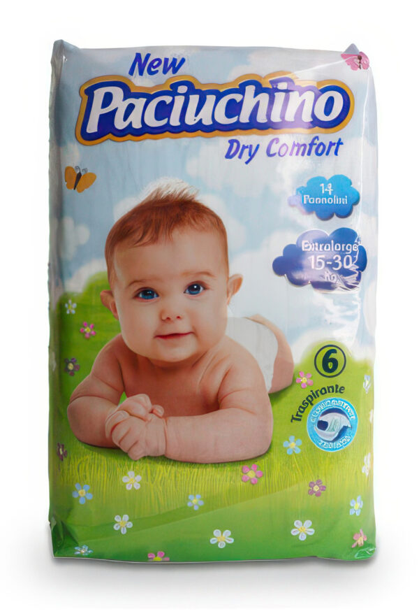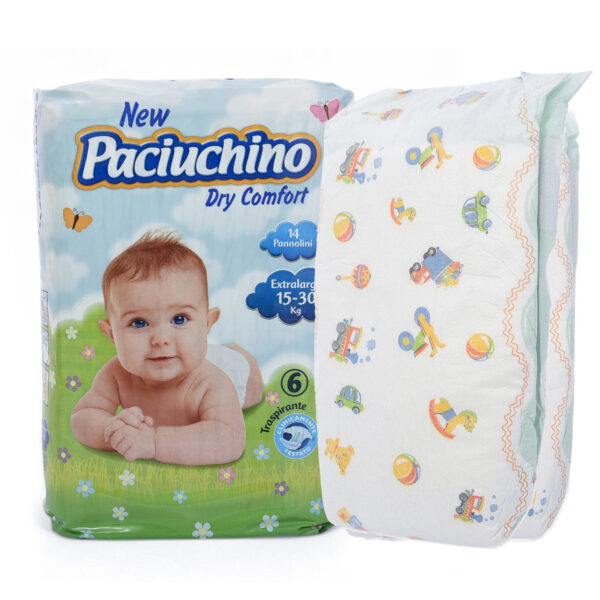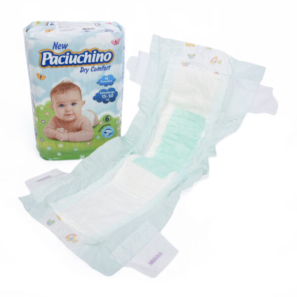 Нові підгузники Paciuchino – це інноваційний захист для вашого малятка. Анатомічна центральна частина, яка складається з м’якого пуху чистої білої целюлози, екологічно змішаної з суперабсорбуючими полімерами, забезпечує ефективне вбирання великої кількості рідини.