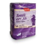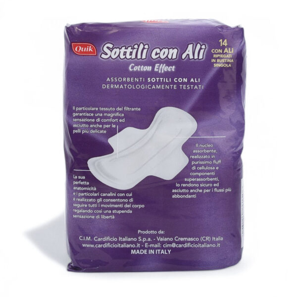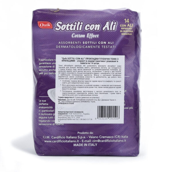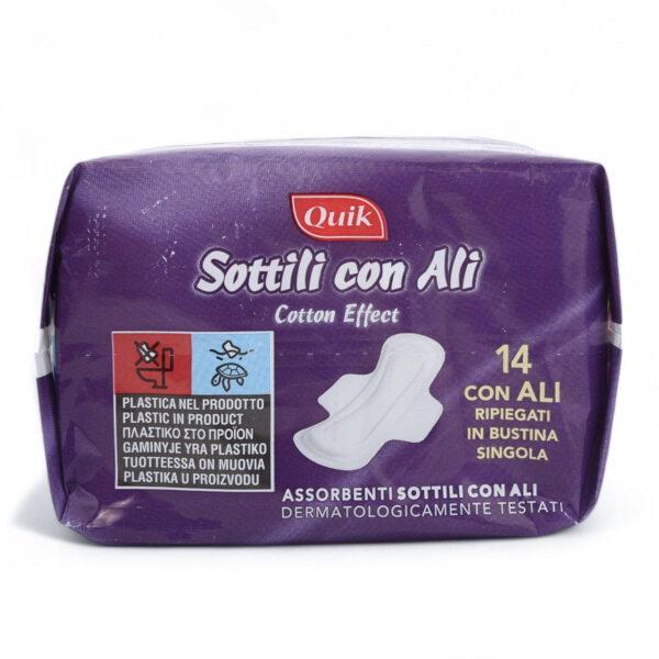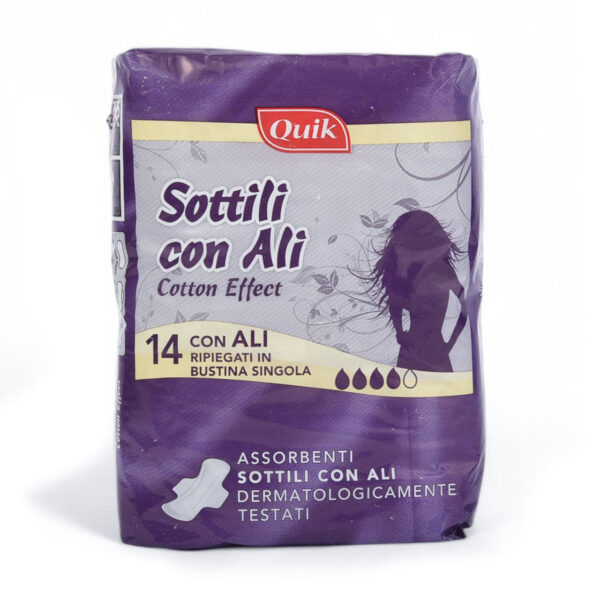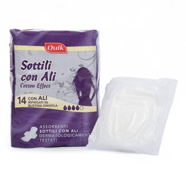 “Quik SOTTILI CON ALI” – це гігієнічні тонкі прокладки з крильцями, складені в окремі пакетики та упаковані по 14 штук в пакети. Тонкі абсорбуючі крильця, які дозволяють закріплювати прокладку ззовні трусів для більшої безпеки, мають центральну частину, що складається з суміші м’якого пуху, чистої целюлози та суперпоглиблюючих полімерів, що дозволяє виробу мати високу поглиблюючу здатність. В центрі є дві канали, які можуть більше розподіляти рідини і направляти їх в частину з найбільшою поглиблюючою здатністю.