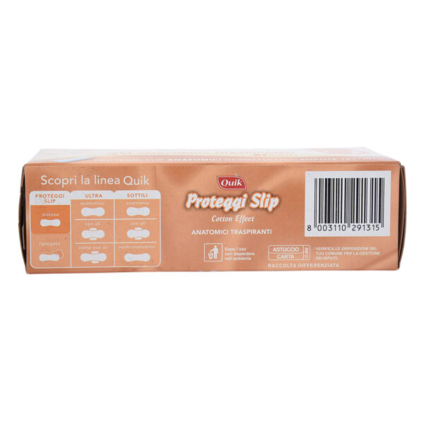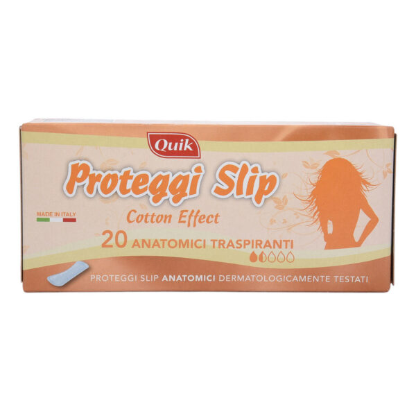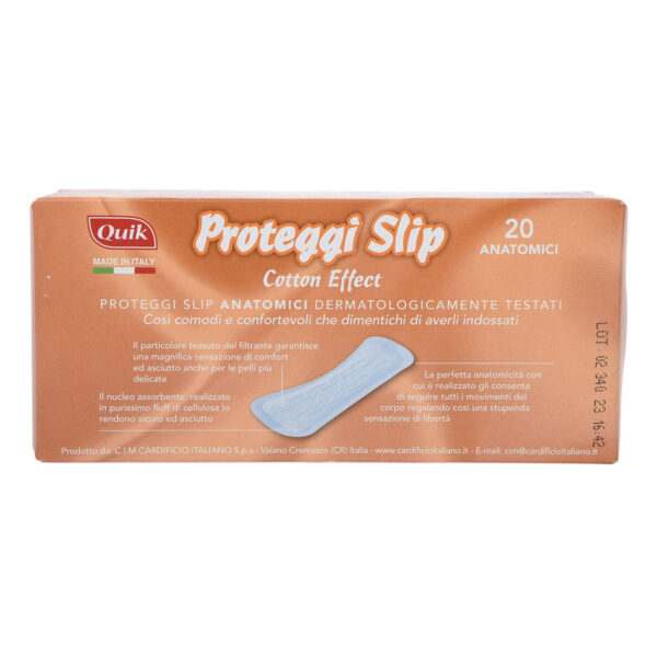 Quik PROTEGGI SLIP – це продукт, який складається з м’якої целюлозної пухової суміші та суперабсорбуючих полімерів, що дозволяє забезпечити захист від невеликих витоків. Фільтр з нетканого матеріалу відрізняється особливою м’якістю і ніжністю, а задній шар виготовлений зі спеціального матеріалу, що гарантує максимальну повітропроникність.